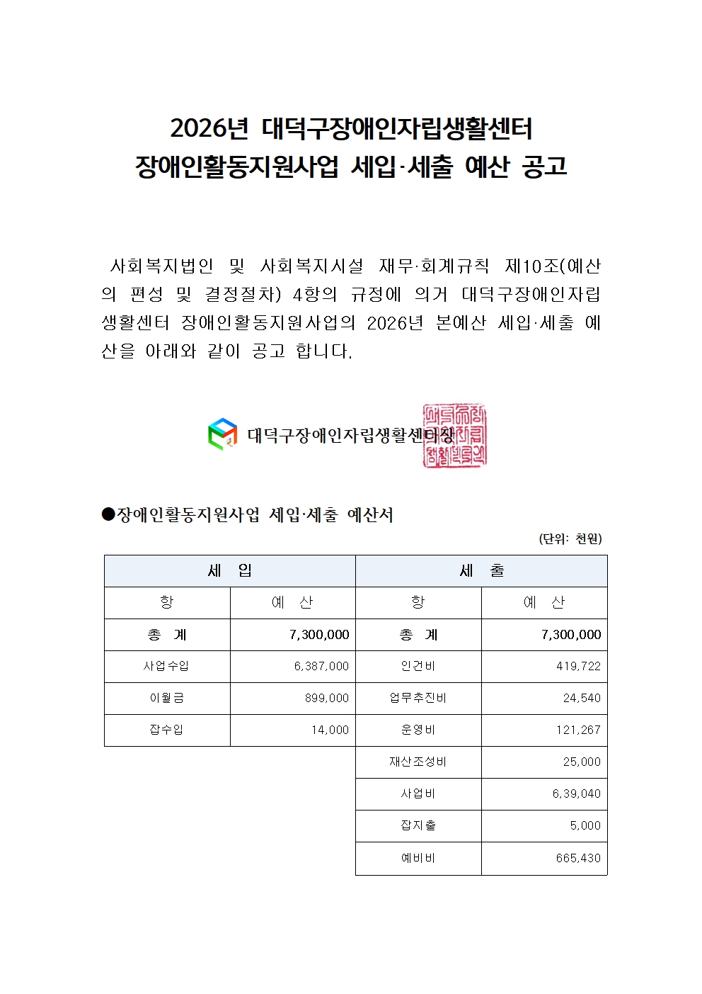 | 제목 | 대덕구장애인자립생활센터 장애인활동지원 2026년 본예산(안) 공고 | ||||