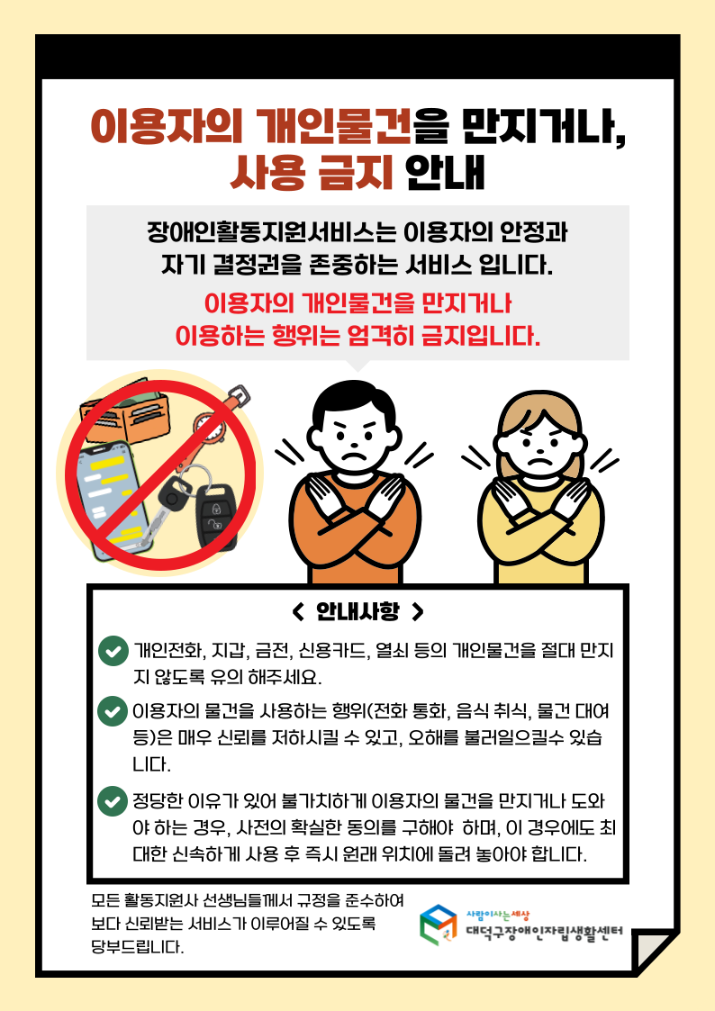 | 제목 | 이용자의 개인물건을 만지거나, 사용 금지 안내합니다. | ||||